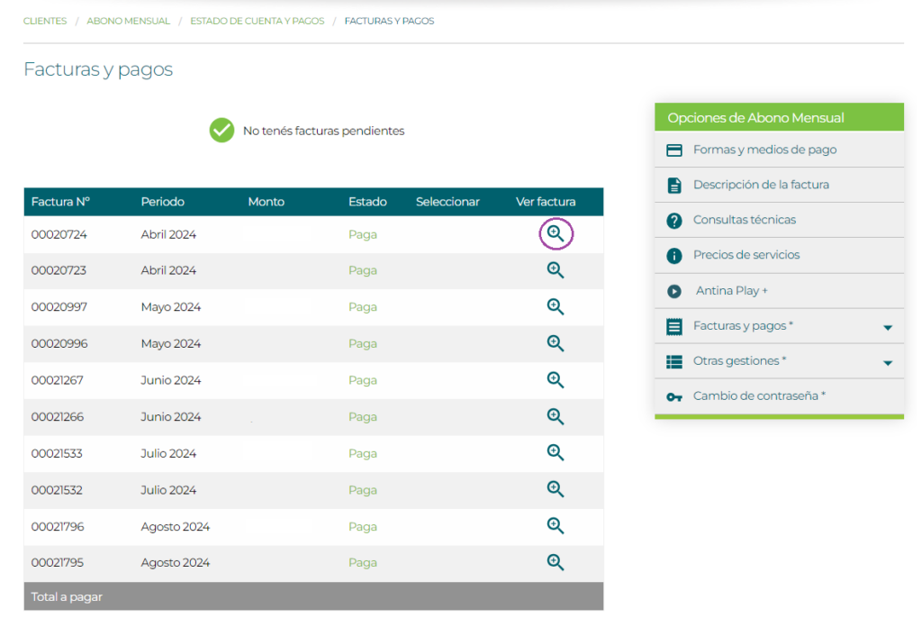 Accioná el ícono de la lupa en la factura que quieras descargarte. Tené en cuenta que se descargan en formato PDF por lo que vas a necesitar tener instalada alguna App o Software que pueda abrir este tipo de documentos.
