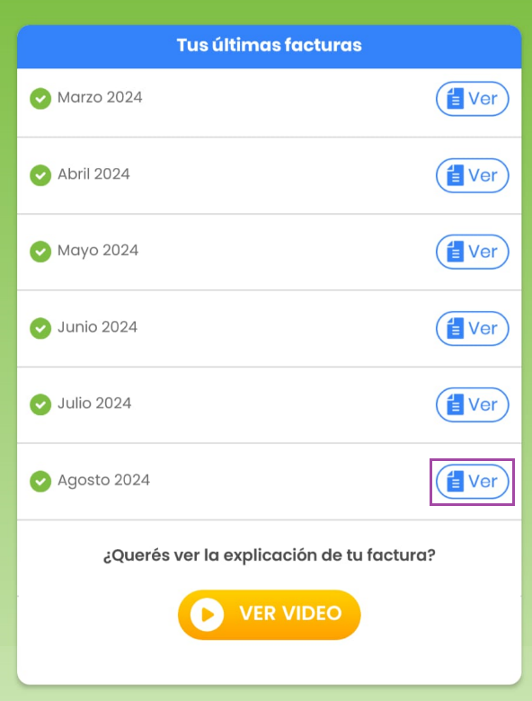 En la HOME, desplazate hacia abajo hasta encontrar el panel de Tus últimas facturas. Luego, accioná el botón VER de la factura que quieras consultar.