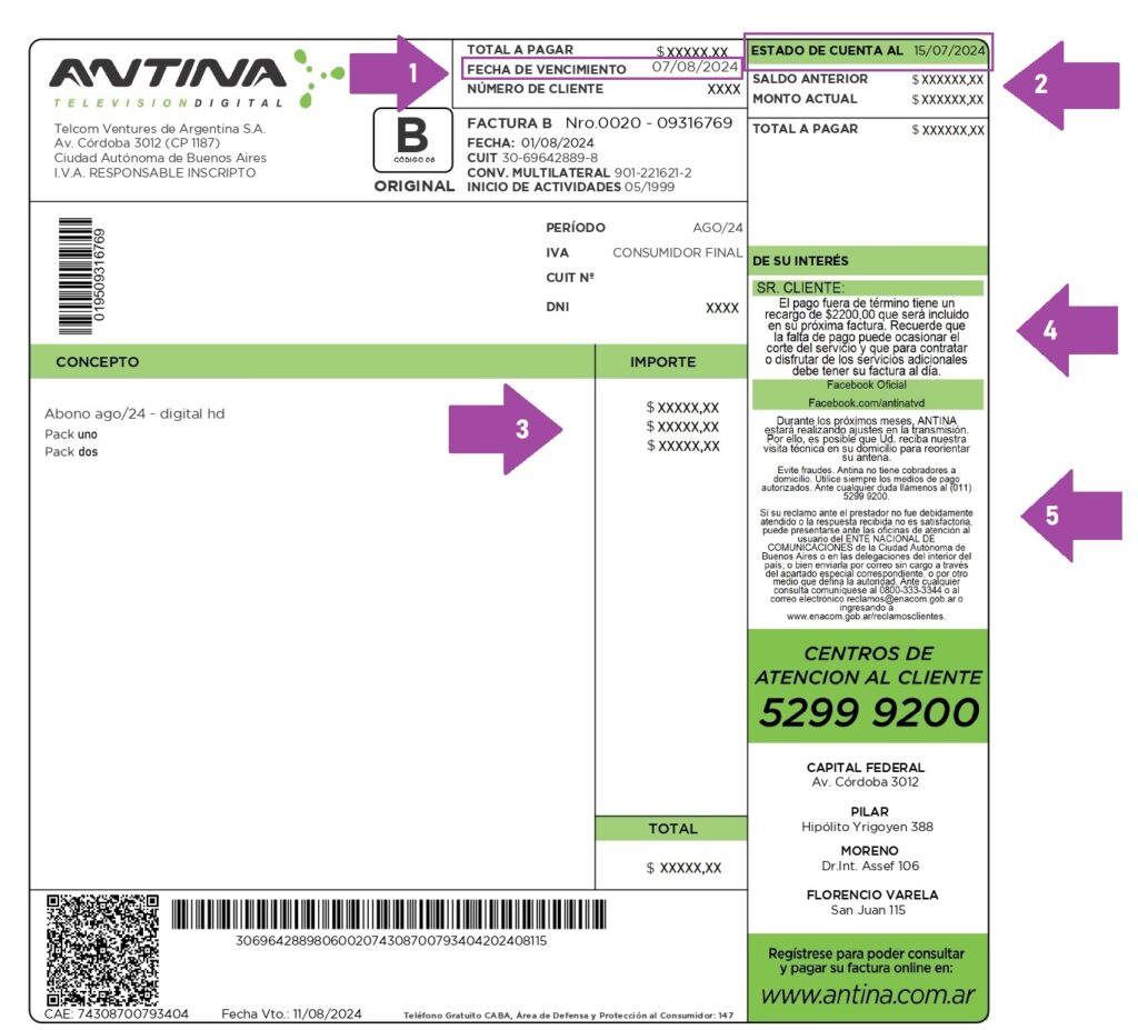 La factura de Antina está cuidadosamente diseñada para proveerte de información importantísima sobre tus saldos, consumos, planes y packs contratados.