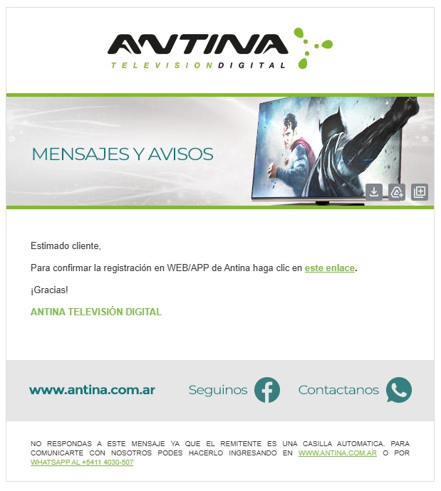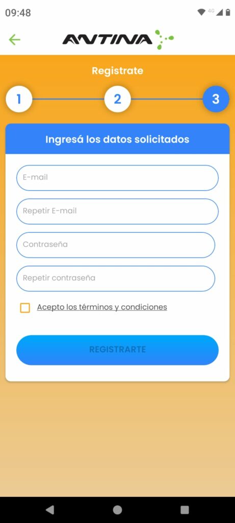 Cada registro en la App de Antina es único para cada número de cliente. A cada número de cliente le tendrás que asignar un nuevo mail y contraseña. Estos datos no pueden ser los mismos.