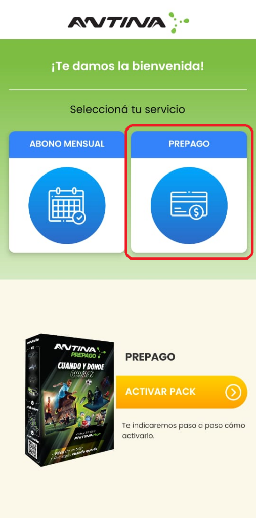 Si todavía no activaste tu Kit Prepago, podés elegir la opción inferior mediante el botón que dice ACTIVAR PACK para recibir instrucciones paso a paso de cómo instalar y activar tu Kit Prepago Antina.