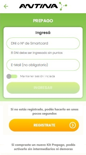 Abrí la App y elegí la opción PREPAGO, que encontrarás a la derecha de la pantalla: