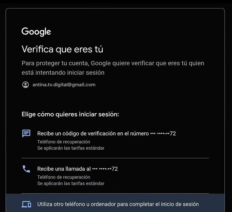 Validá el acceso según el método de autenticación que tengas configurado en tu Cuenta Google (recibir un código por llamada, por SMS, o usar una App de Autenticación):