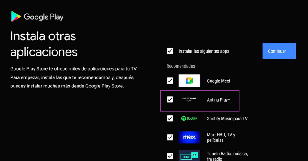 Por último, Google te consultará por las Apps que quieras instalar, y te dará una lista de sugerencias. Asegurate de tildar AntinaPlay+: