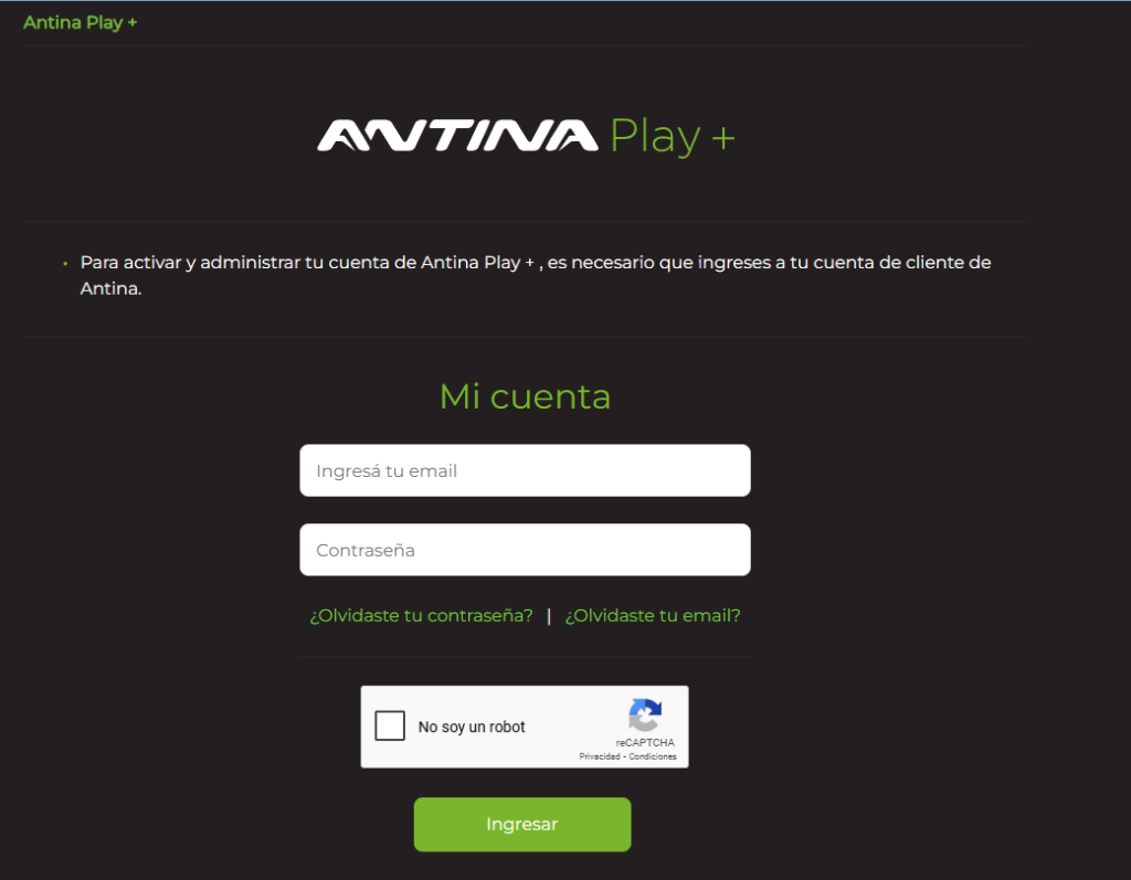 Después de ingresar tus Credenciales Antina podrás conocer tu usuario ANT y contraseña de AntinaPlay+ que deberás usar para loguearte en cada dispositivo donde quieras usar AntinaPlay+ para ver TV por streaming.