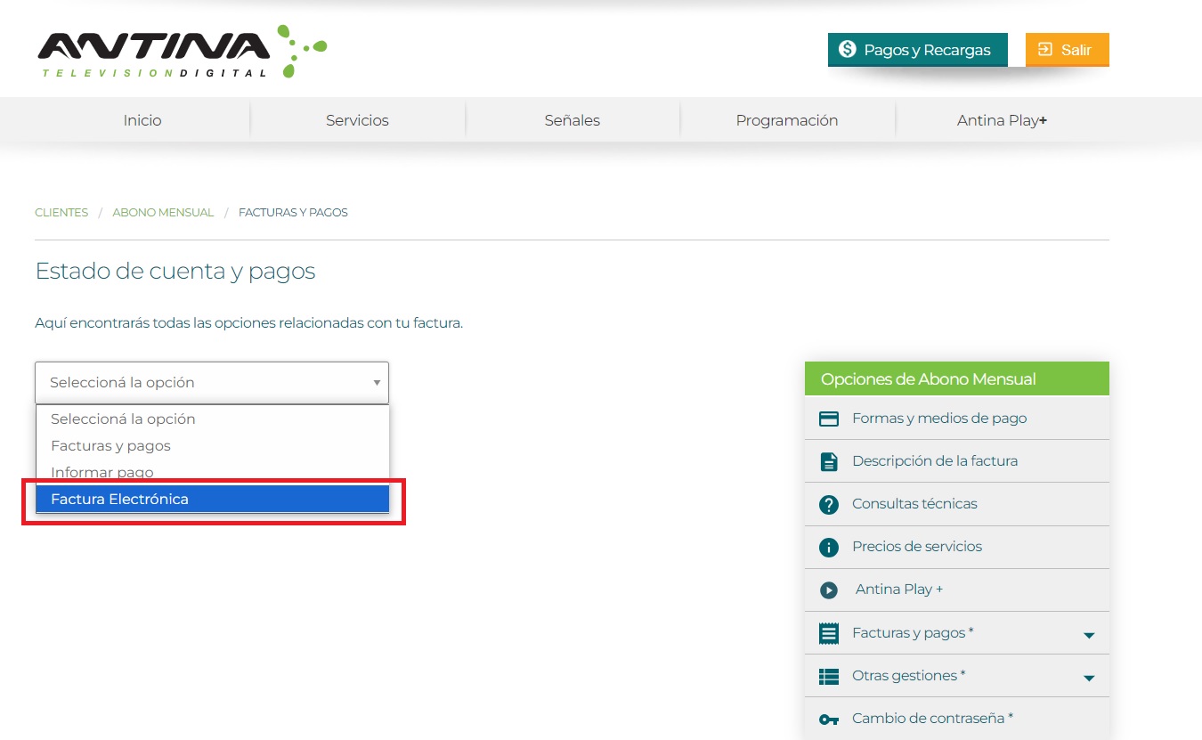 A continuación te indicamos cómo hacerlo desde la Web de Antina, una vez que te hayas logueado.