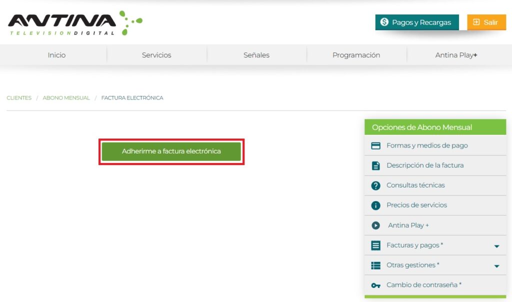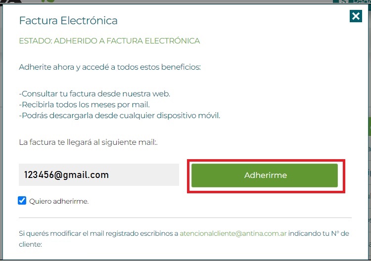 Accioná el botón Adherirme a factura electrónica.