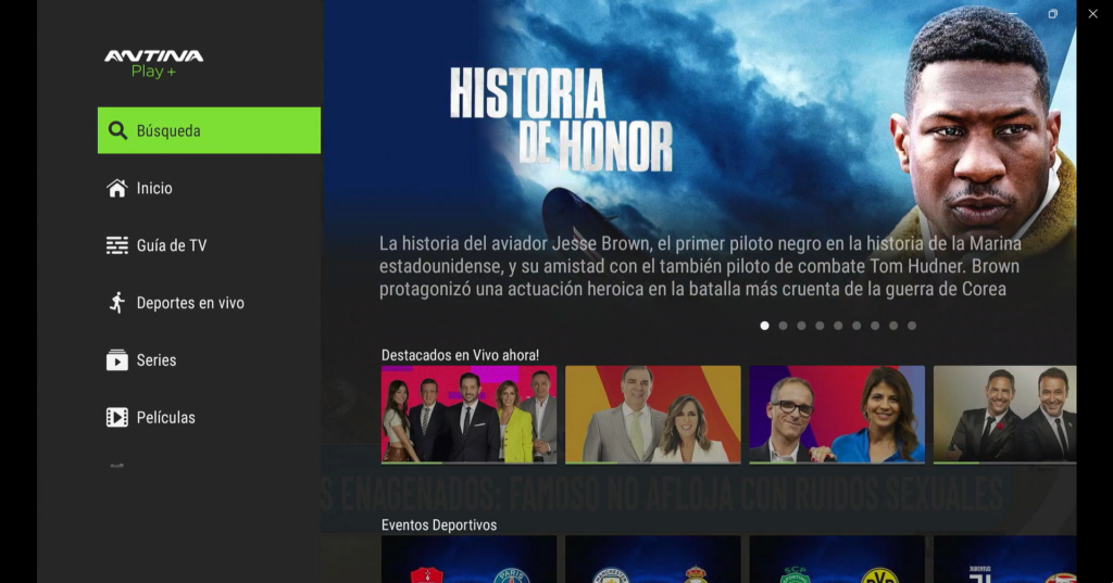 Una vez que te loguees en cualquiera de los dispositivos que uses AntinaPlay+ verás, con pequeñas diferencias, la misma interfaz visual. Tal como lo hacen casi todos los servicios de streaming, podrás navegar en la pantalla principal (donde el sistema te ofrecerá acceso a sugerencias y/o a los contenidos que ya hayas empezado a ver) o podrás navegar por el menú lateral.
