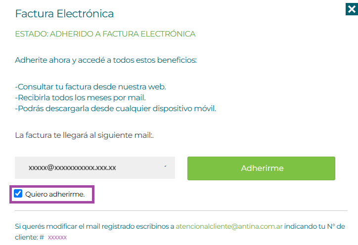 Tal como indica la imagen, si querés modificar la dirección de correo electrónico a la que te enviamos la factura, deberás escribir un mail a atencionalcliente@antina.com.ar indicando tu número de cliente, que aparece después del numeral (#).
