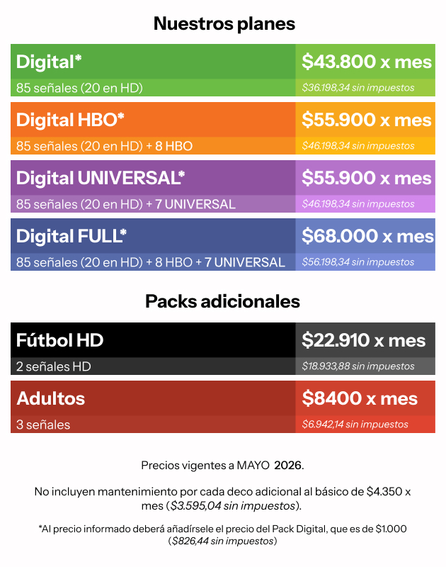 $9.300 ($7.685,95 sin impuestos) mensuales + $4.350 ($3.595,04 sin impuestos) mensuales por cada deco adicional.