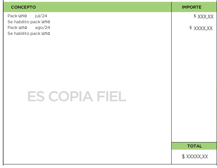 En la imagen de ejemplo, el pack fue pedido durante el mes de julio. Entonces, la factura (que vence el 7 de agosto) contiene el importe completo del pack facturado por adelantado para el mes de agosto + el importe proporcional del mismo pack por los días de julio.